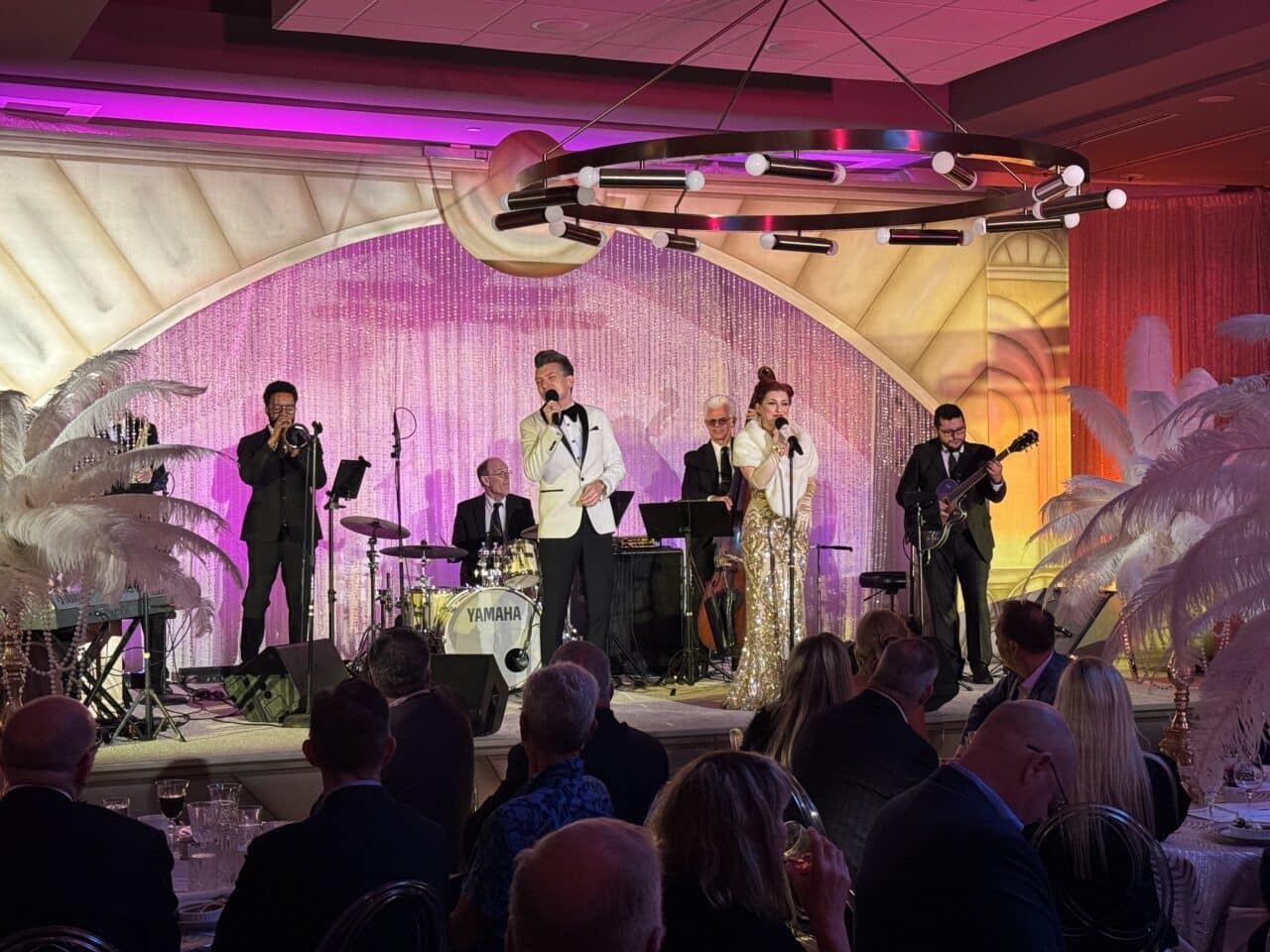 A custom musical revue featuring a starlet and crooner, backed by a live band. The show honored icons like Frank Sinatra and Judy Garland, with narration connecting each performance to the golden age of film. Cocktail hour included character appearances by Marilyn Monroe and Charlie Chaplin to set the tone with vintage charm.