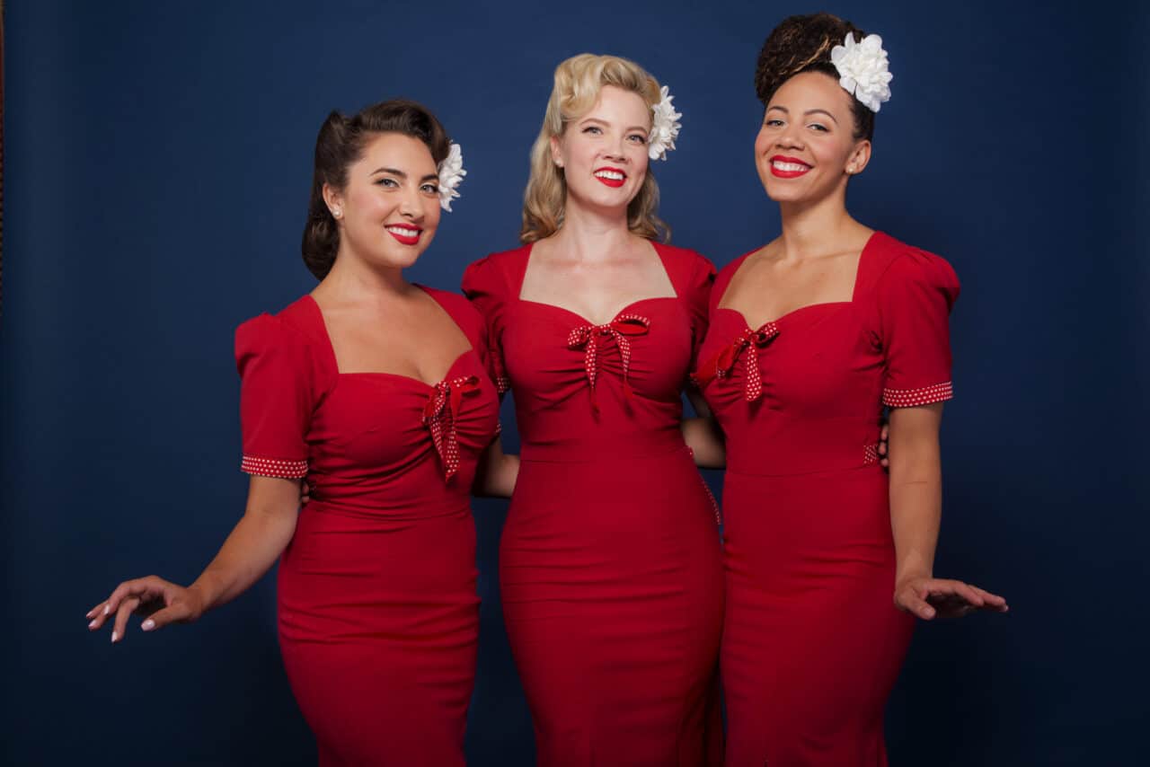 Their signature look? Pin-up inspired military pencil dresses and cherry red wiggle dresses that nod to the USO shows of World War II. Their stage presence evokes a bygone era while remaining electric and fresh.